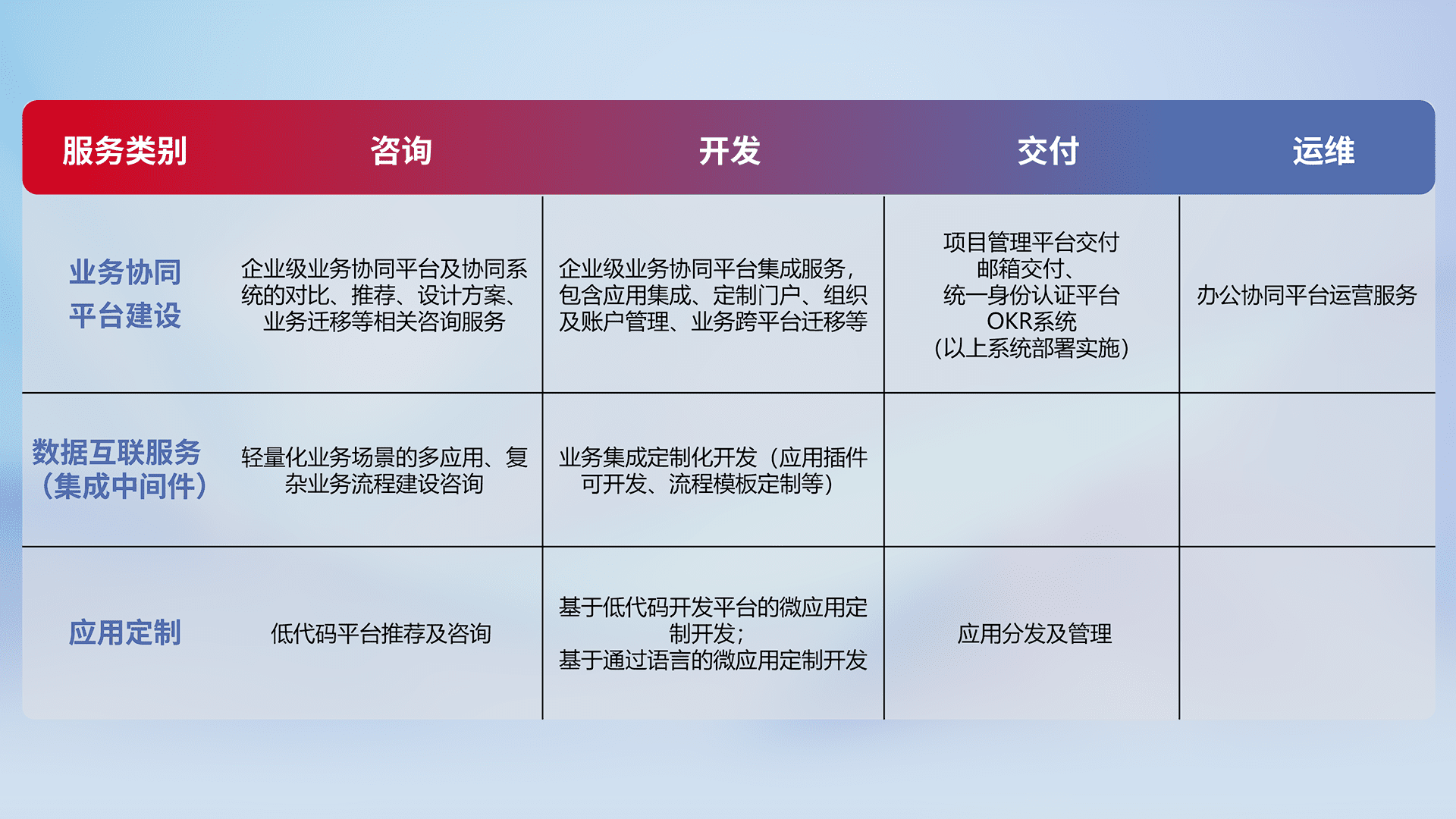针对钉钉、、、、企微、、、IDaas等平台级产品提供产品的规划、、方案、、、、交付、、定制化开发等服务,,,,实现如统一协同办公、、、、智能客户服务、、混合会议管理、、、、智能数据查询、、、等业务场景,,,实现数字化转型。。。