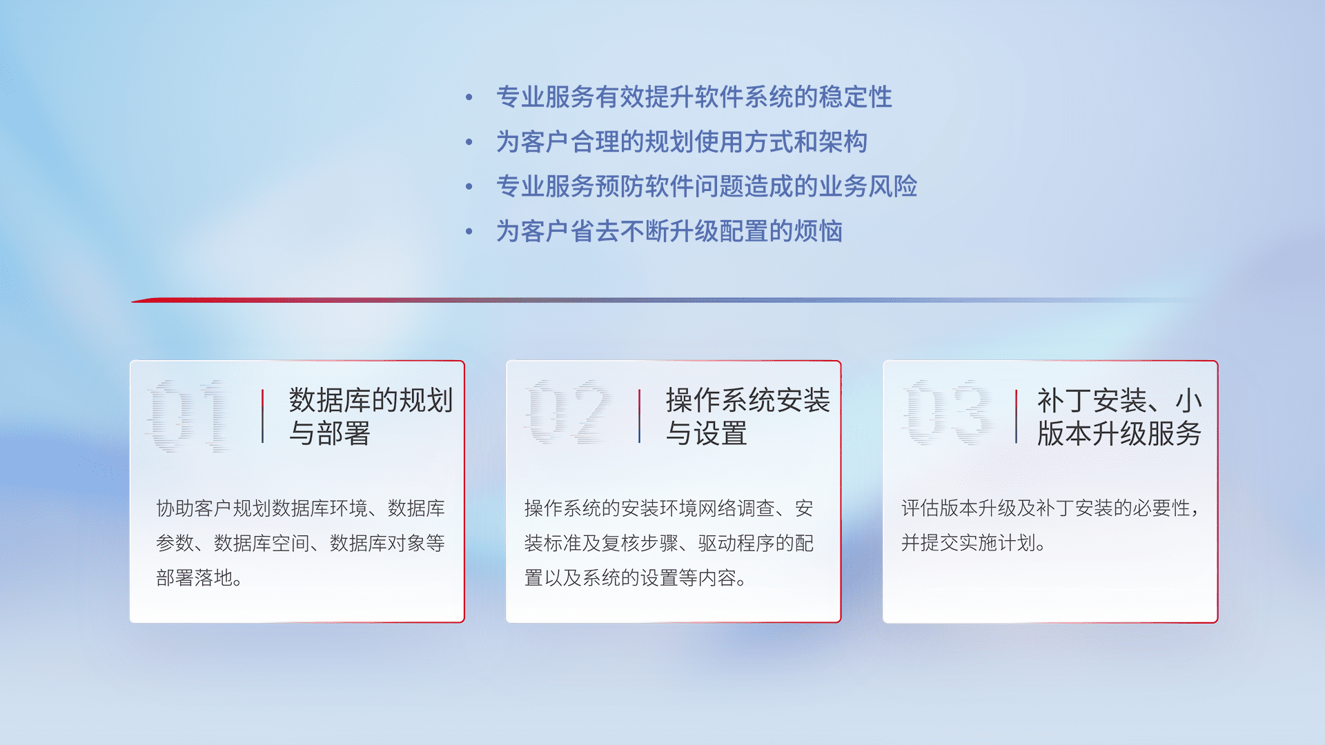 为客户提供软件规模升级、、、、快速部署、、按需配置的专业服务,,,,从数据库的规划与部署到操作系统的安装与设置,,,,再到补丁安装和小版本升级提供支持。。。